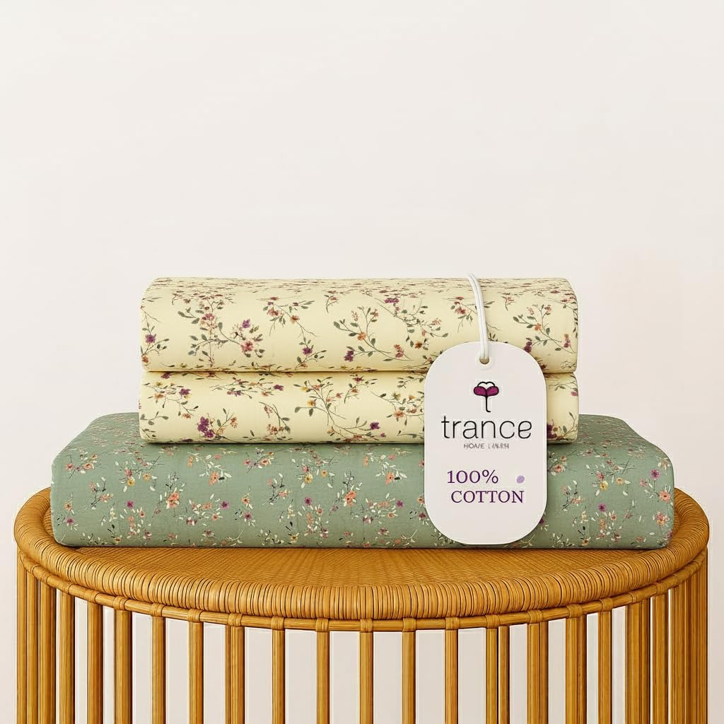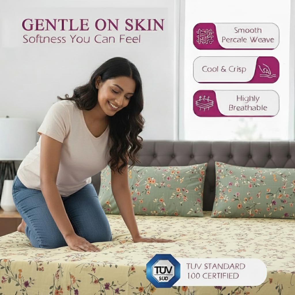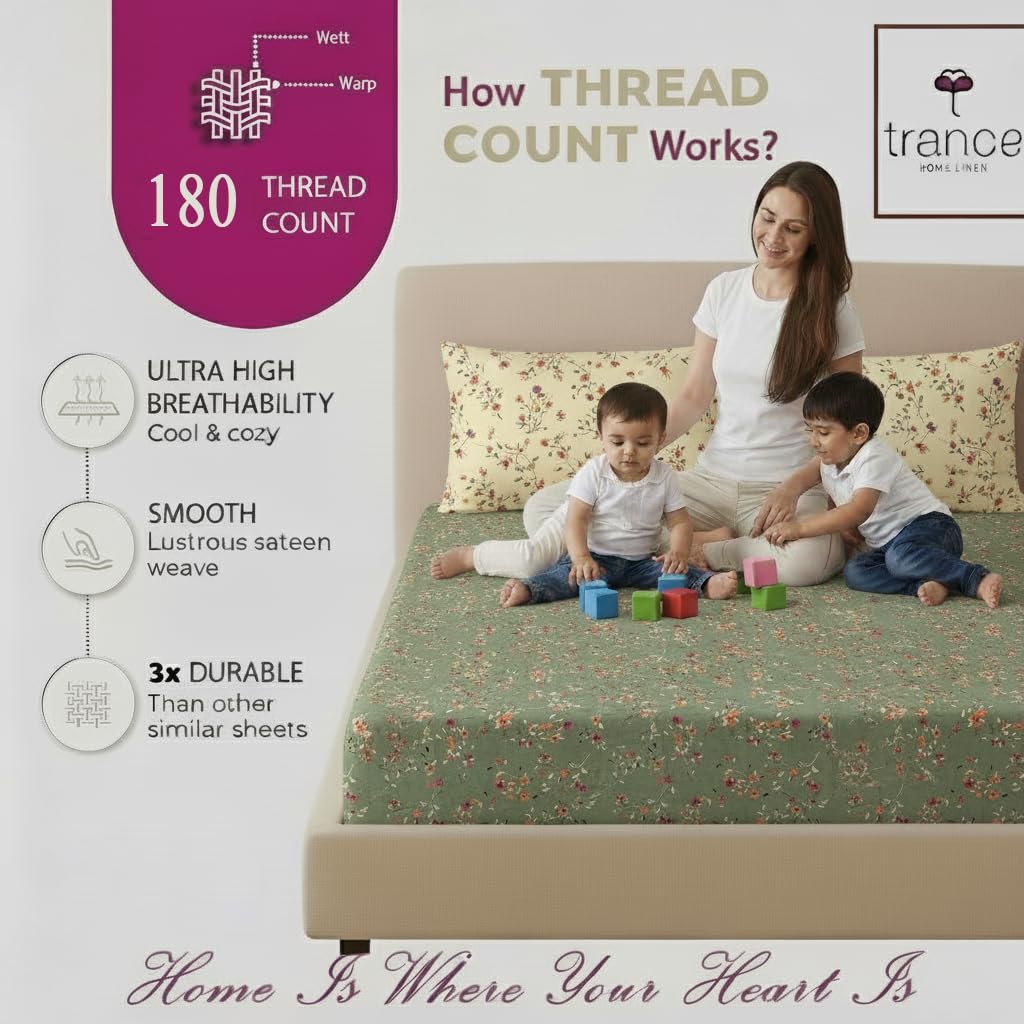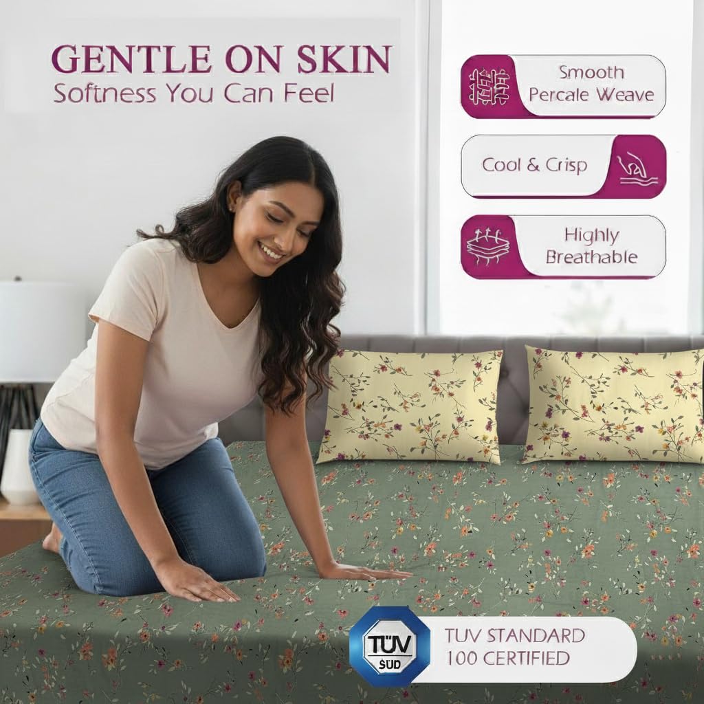 100% Cotton 180TC Printed Flat Bedsheet with Pillow Covers - Lilly ivory green