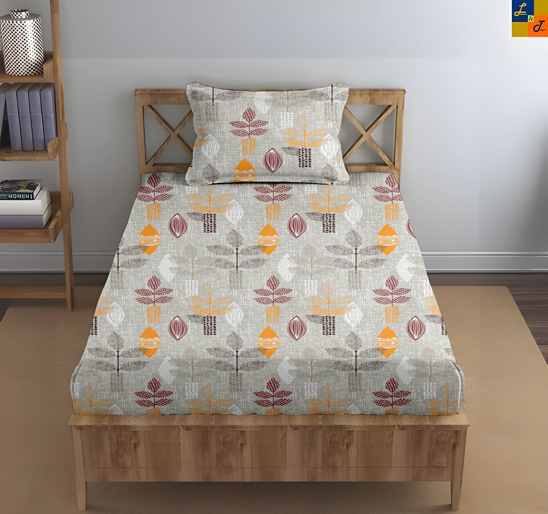 Cotton Printed Fitted Bedsheet with Pillow Covers (Textured Leaves 100% Cotton & 144 TC)